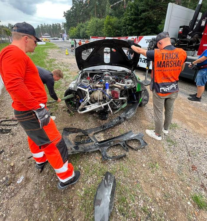 Jeden z dzisiejszych przejazdów treningowych przed 4. rundą Drift Masters Grand Prix w Rydze zakończył się dla mnie tak, jak widzicie na załączonych zdjęciach. Zblokowane koła, prędkość 174 km/h i betonowa banda, a przyczyną okazała się awaria paska od wspomagania. Sytuacje takie jak ta są wpisane w ten sport, auto naprawimy, a mi nie stało się nic poważnego – poinformował swoich fanów na Facebooku Eryk Goczał.