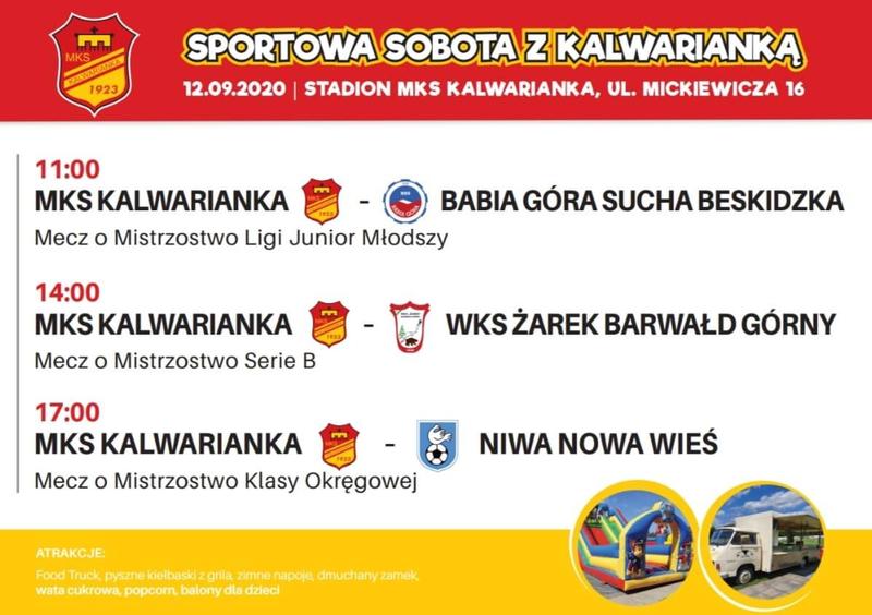 O godzinie 14.00 Kalwarianka II zagra z WKS „Żarek” Barwałd Górny (mecz o mistrzostwo B klasy). Kolejnym meczem seniorów będzie ten o godzinie 17.00. Wówczas Kalwarianka zagra o mistrzostwo Okręgówki z LKS „Niwa” Nowa Wieś.