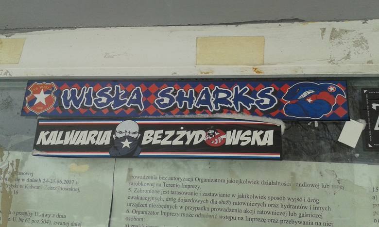 Wisła Sharks. Kalwaria bezżydowska – czytamy na emblematach doklejonych w klubie Kalwarianka.