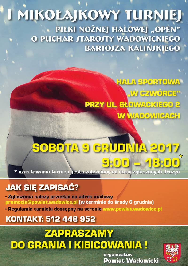 Na taką imprezę czekaliśmy kilka lat. Ruszyły bezpłatne zapisy do Mikołajkowego Turnieju Piłki Nożnej Halowej „open” o puchar starosty Bartosza Kalińskiego. Rozgrywki odbędą się 9 grudnia w hali sportowej wadowickiej „czwórki”. Zapisać mogą się zarówno zawodnicy niezrzeszeni, jak i zrzeszeni w klubach piłkarskich.