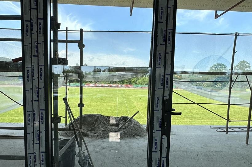 Stan surowy zamknięty jest już prawie gotowy i choć to dopiero na półmetek tej budowy to już teraz gotowy jest jeden element, który za wiele się nie zmieni. To widok z ogromnych okien na I piętrze, przez które – nie wychodząc z budynku – będziemy mogli śledzić to, co dzieje się zarówno na orliku, na boisku ze sztuczną nawierzchnią oraz oczywiście na boisku głównym i (w przyszłości) na nowej bieżni – dodaje burmistrz.