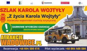 We wtorek (25.08) wadowicka ciuchcia zaprasza na darmowe kursy. Kolejka będzie wozić wszystkich chętnych szlakiem trzynastu najważniejszych miejsc związanych z życiem Karola Wojtyły. Wycieczka kolejką trwa ok. 40 min.