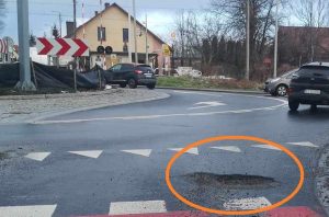Tutaj mogło dojść do groźnej sytuacji drogowej. Kierowca auta osobowego wjechał w dziurę i uszkodził samochód. Na szczęście nie stało się nic poważniejszego.