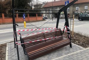 Słynne bujane ławki w Wadowicach, ustawione przy okazji przebudowy ulicy Lwowskiej, mogą być wadliwe? Jedna z nich jest uszkodzona i nie wygląda to na działanie wandala, ale raczej na wadliwą konstrukcję.