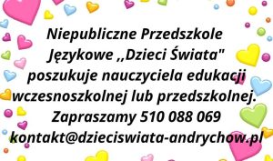 Dołącz do naszego zespołu! niepubliczne Przedszkole Językowe „Dzieci Świata” poszukuje nauczyciela edukacji wczesnoszkolnej lub przedszkolnej.