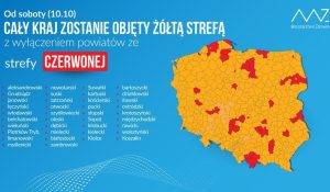 Od 10 października cała Polska będzie znajdować się w strefie żółtej; w całym kraju będzie obowiązywało zakrywanie nosa i ust w przestrzeni publicznej; w lokalach gastronomicznych będą obowiązywać dodatkowe restrykcje; zostanie zwiększona liczba łóżek w szpitalach – podkreśliło komunikacie CIR.