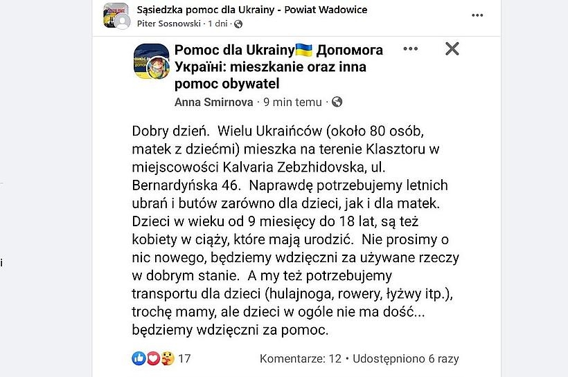 Posty z ogłoszeniami o pomocy dla Uchodźców można znaleźć na grupie fejsbukowej Sąsiedzka pomoc dla Ukrainy – Powiat Wadowicki. Tam ludzie organizują się w grupę, która stale wspiera gości. Dzięki takiej mobilizacji udało się już wielokrotnie znaleźć potrzebne rzeczy, mieszkania, czy nawet prace dla Ukraińców w Polsce.
