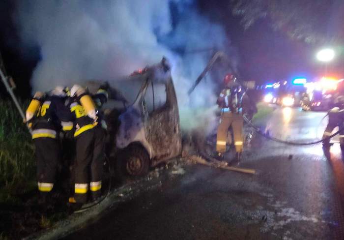 Auto jak pochodnia na drodze w Ryczowie. Dostawczak spłonął doszczętnie