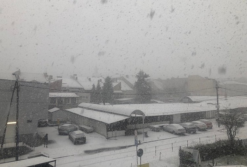Od rana w Wadowicach mocno wiało i padał deszcze. Po południu wystarczyło kilka minut, by po opadach deszczu przyszły grzmoty i pioruna, a za chwilę przykryły opady białego puchu.