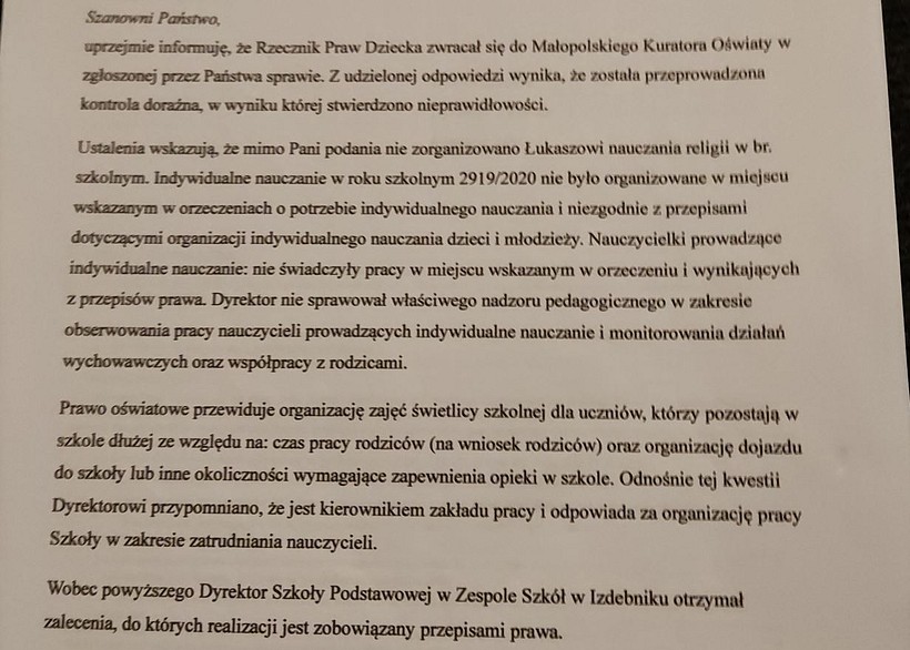 Tymczasem szkoła w Izdebniku uznaje, że wszystkie aspekty realizacji nauczania indywidualnego chłopca organizowane są zgodnie z rozporządzeniem Ministra Edukacji Narodowej oraz w oparciu o orzeczenie o potrzebie nauczania indywidualnego, które wydane zostało ze względu na stan zdrowia ucznia uniemożliwiający uczęszczanie do szkoły.