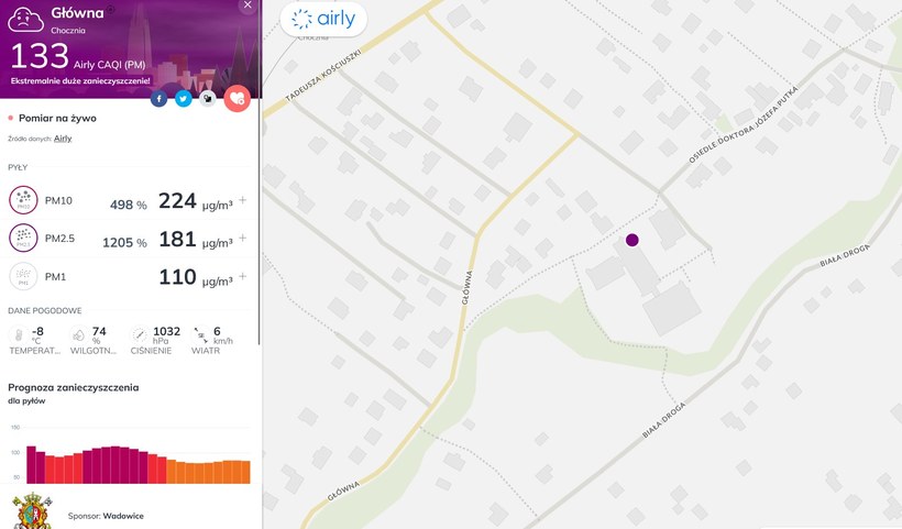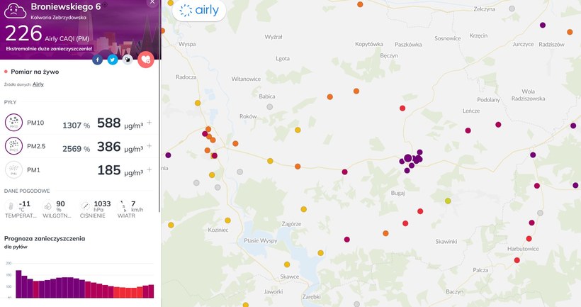 W Kalwarii Zebrzydowskiej stan powietrza monitoruje dziewięć czujników Airly. W poniedziałek przed południem, wszystkie wskazywały „ekstremalnie duże zanieczyszczenie”. Normy WHO dla pyłu zawieszonego PM10 przekroczone były tutaj 13- krotnie, a dla pyłu PM 2,5 przekroczenia były aż 25-krotne.