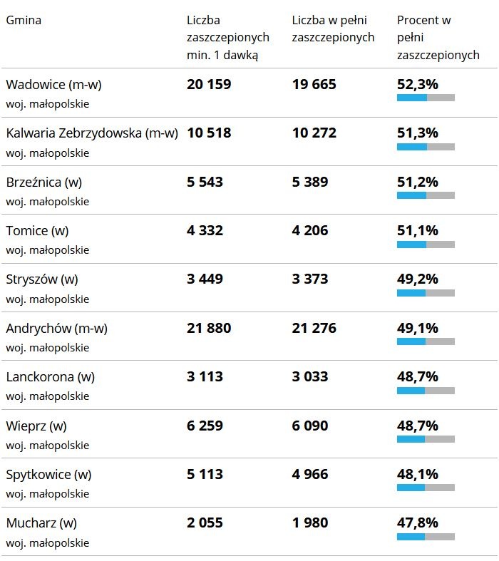 W powiecie wadowickim 4 na 10 gmin osiągnęły poziom zaszczepienia powyżej 50 procent populacji. Są to Wadowice, Kalwaria Zebrzydowska, Tomice i Brzeźnica.