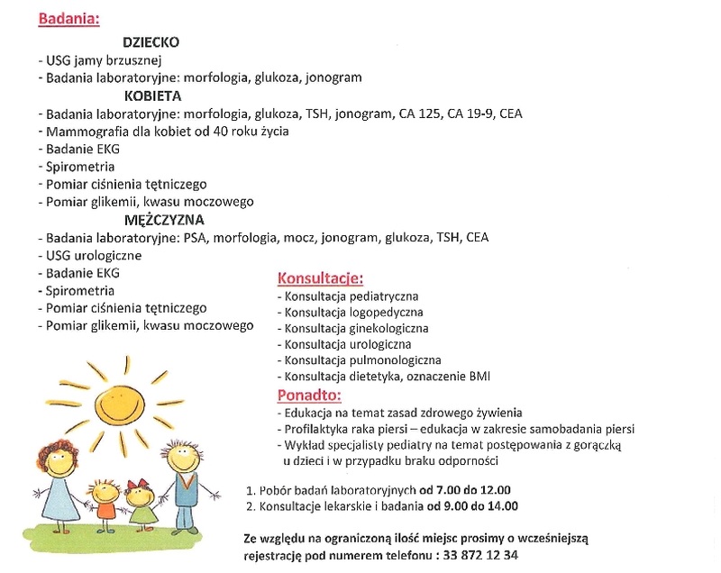 Pobór badań laboratoryjnych odbędzie się w godz. od 7.00 do 12.00, a konsultacje lekarskie i inne badania w godz. od 9.00 do 14.00.