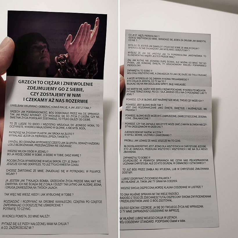 Znalazłam w środę list od diabła w swojej skrzynce na listy. Początkowo odruchowo miałam zamiar wyrzuć, ale spojrzałam na tekst. Zaczęłam czytać i zamarłam. List jest obsceniczny, pełen wulgaryzmów. Jestem zbulwersowana – mówi pani Katarzyna.