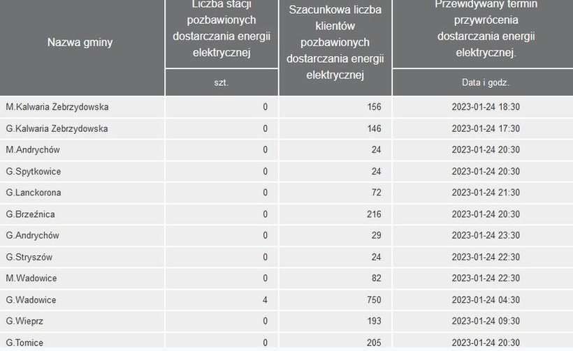Z zebranych od Tauronu przez sztab w starostwie w Wadowicach informacji wynika, że kłopoty z energią jeszcze potrwają. W poszczególnych miejscowościach przywracanie dostaw prądu ma nastąpić między godz. 4, a 23 we wtorek, 24 stycznia.