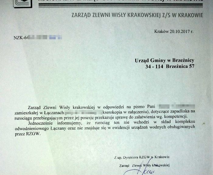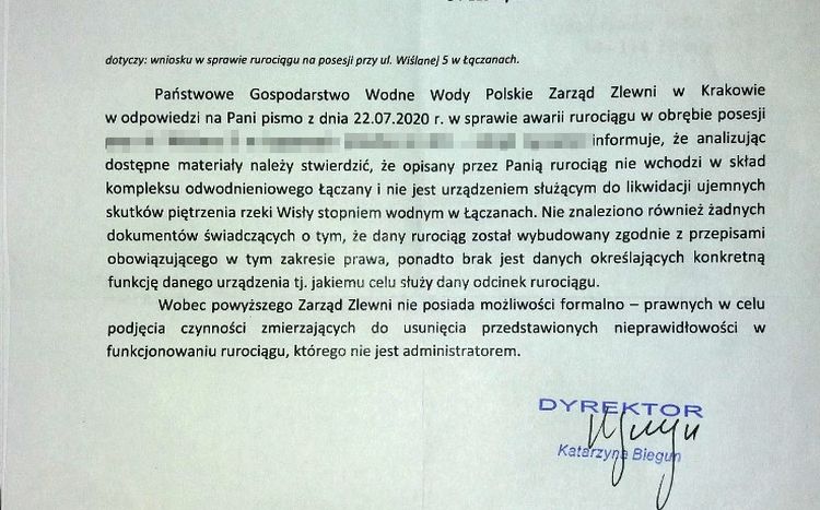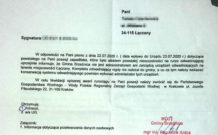 Mieszkanka Łączan od 2017 roku koresponduje z Wodami Polskimi, RZGW i gminą Brzeźnica. Urzędnicy przerzucają się problemem jak gorącym ziemniakiem, a pani Teresa pozostaje z tym wszystkim sama.