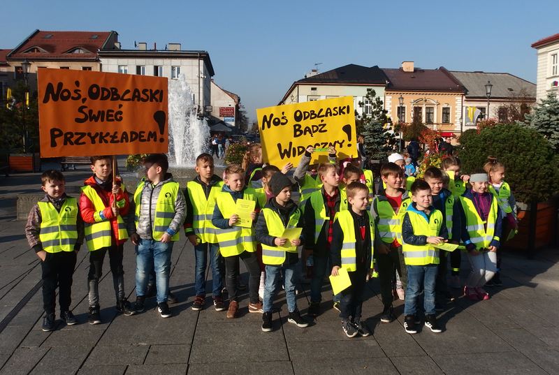 Noś odblaski, nocą świeć, bo to bardzo ważna rzecz! – wykrzykiwały chórem dzieci i wręczały mijanym osobom ulotki informacyjne oraz opaski odblaskowe.