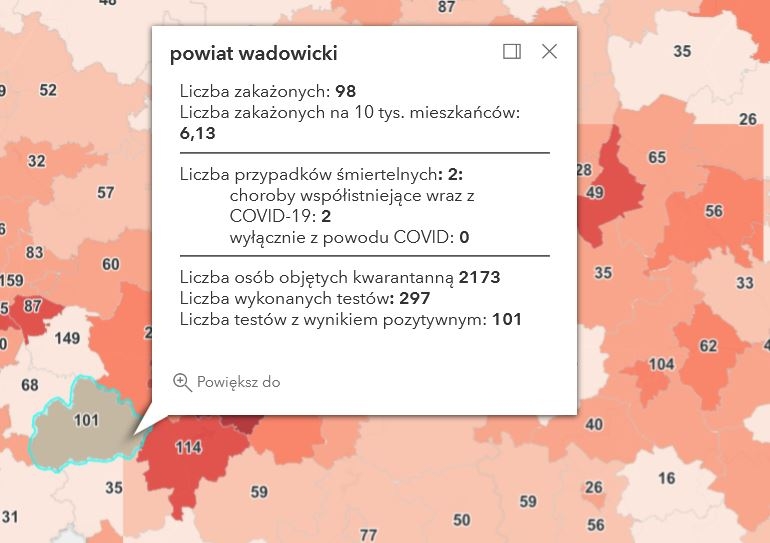 Według danych Ministerstwa Zdrowia, w powiecie wadowickim liczba nowych zakażeń w piątek (26.11) to 98 nowych przypadków, dzień wcześniej było ich 101.