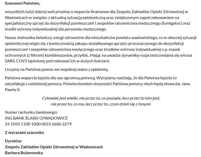 Tymczasem dyrekcja wadowickiej lecznicy prosi o dalszą pomoc.