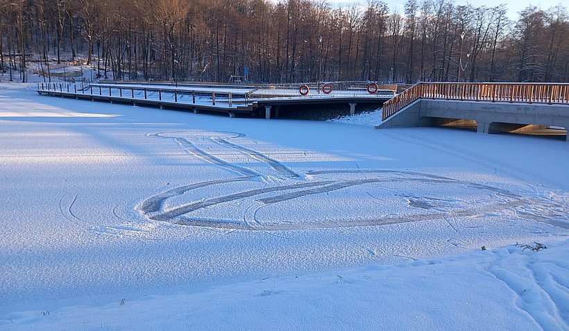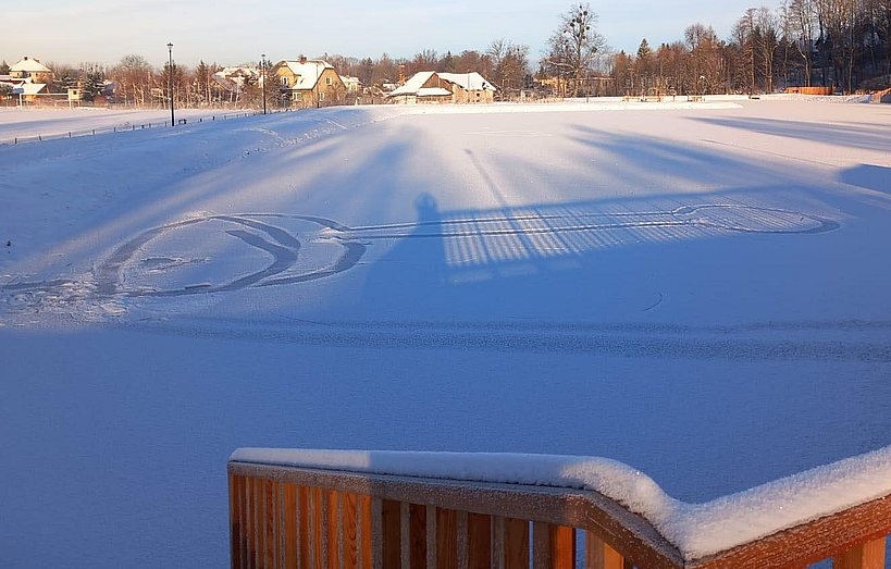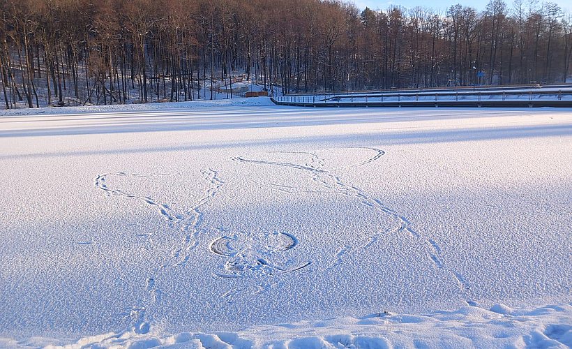 Na stawie pojawiły się śnieżne rysunki. Prawdopodobnie ich autorami były bawiące się tutaj dzieci.