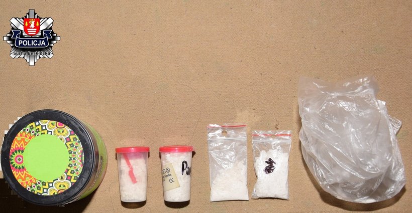 Po wewnętrznych oględzinach budynku policjanci zabezpieczyli susz roślinny w ilości 2,6 grama, określany jako marihuana, oraz biały proszek, który okazał się być mefedronem, w ilości 186 gramów.
