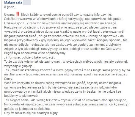 Tak , może nieszkodliwy zboczeń, a może gdyby któraś z nas biegła sama pobiegł by za nią. Nie wiemy tego więc nie ocenia, ale nikt normalny spodni na ścieżce nie ściąga. Sorry. Wiec kto korzysta ze ścieżki radzę wzmożona czujność, najlepiej unikać biegania samemu ale tez jestem za tym by nie dawać się zastraszać takim ludziom tylko powodować by oni unikali takich miejsc wiedząc ze to im bezkarnie nie ujdzie i ze będziemy to piętnować – pisze dalej.