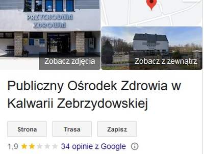 Opieka całodobowa w Kalwarii nie istnieje… „Lekarz”, bo nie można tak nazwać osoby, która przyjmuje chorych w tym miejscu, uważa się za Boga. Zamyka w niedzielę pokój o 17 i mówi pacjentom przebywającym w ośrodku, że on kończy na dzisiaj pracę i jak ktoś chce to może czekać do 20 na kolejnego lekarza, wysyła ich na całodobową opiekę do Suchej Beskidzkiej, albo do Wadowic. Wysyła chorych ludzi 10-20 km dalej z grypą i z gorączką nie udzielając żadnej pomocy!!! Dzieci ponad 40° gorączki czekają 3-5 h na przyjęcie, a osoba zamyka gabinet i idzie do domu. Lekarz nie zna podstaw prawnych, na wejściu pyta „czego pan ode mnie oczekuje”, wulgarnie odnosząc się do pacjenta. Wysyła do lekarza rodzinnego twierdząc, że on nie jest odpowiedzialnym i prowadzącym pacjenta lekarzem – to tylko jeden z negatywnych komentarzy w wizytówce ZOZ.
