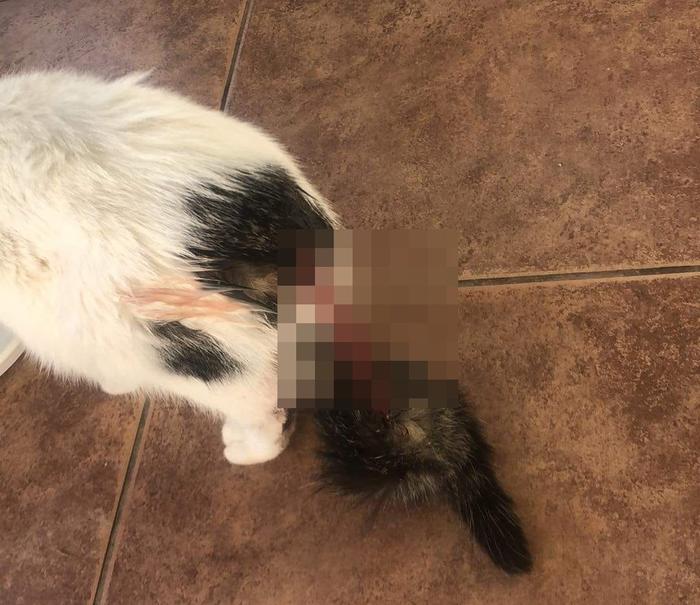 :: Ze względu na drastyczność zdjęcia, zostało ono zamazane, ale widać dramat , który musiał przejść kot. [ fot. Facebook/ WEadowice zwierzęta zgubione…/ Żaneta]