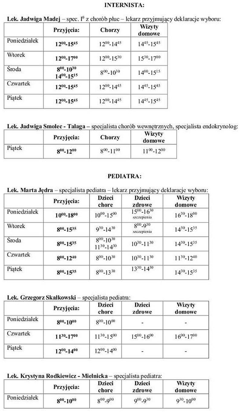 Tymczasem opublikowano dokładny harmonogram przyjęć poszczególnych lekarzy. Dwoje lekarzy przyjmować będzie cały tydzień ( dni powszednie): lek. Jadwiga Madej ( internista) i lek. Marta Jędra ( pediatra). Pozostali medycy będą rzadziej pracowali w przychodni przy Karmelickiej 5.