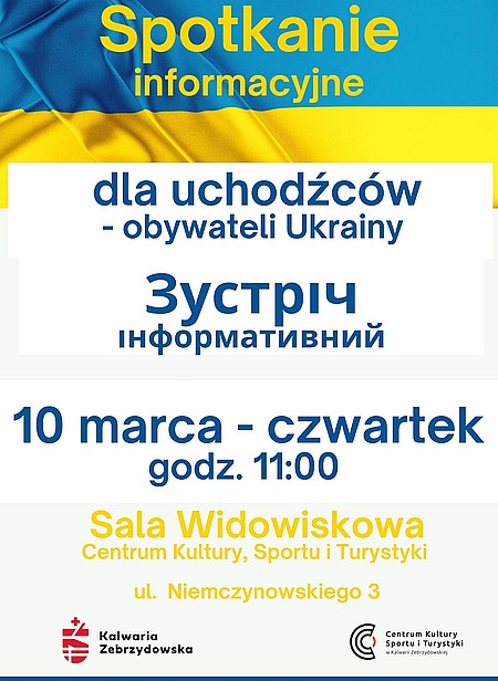 Spotkanie dla obywateli Ukrainy i ich opiekunów odbędzie się w czwartek, 10 marca, o godz. 11:00 w Sali Widowiskowej – Centrum Kultury Sportu i Turystyki w Kalwarii Zebrzydowskiej, ul. Niemczynowskiego 3.