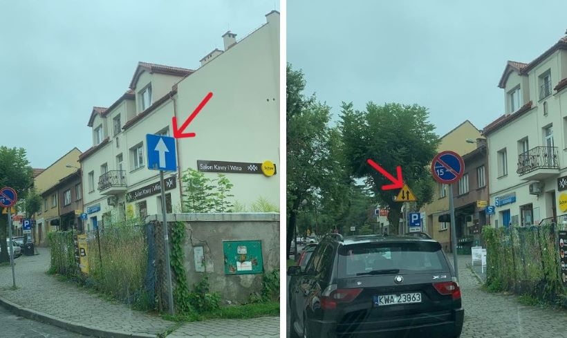 Jeden ze znaków informuje o drodze jednokierunkowej, a może dwa metry za nim jest znak informujący o drodze dwukierunkowej. Między znakami nie ma skrzyżowania, ani nic – dziwi się pan Przemek, który zwraca naszą uwagę na oznakowanie.