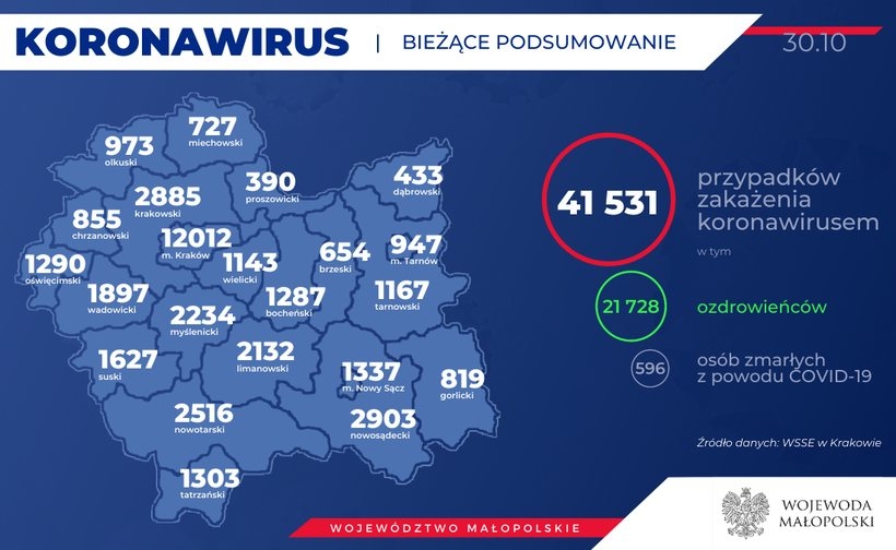 Obecnie w Małopolsce zakażenie koronawirusem zostało potwierdzone u 41 531 osób. Poinformowano też o śmierci 48 osób w wieku od 48 do 100 lat, z Krakowa (17 osób), powiatu oświęcimskiego i tatrzańskiego (po 5 osób), nowosądeckiego, myślenickiego i olkuskiego (po 3 osoby), Nowego Sącza, Tarnowa i powiatu krakowskiego (po 2 osoby) oraz gorlickiego, limanowskiego, nowotarskiego, proszowickiego, tarnowskiego oraz wadowickiego (po 1 osobie). Dwadzieścia dziewięć osób miało choroby współistniejące. Potwierdzono, że przyczyną zgonu był COVID-19. Tym samym w Małopolsce liczba zgonów spowodowanych COVID-19 wynosi 596.