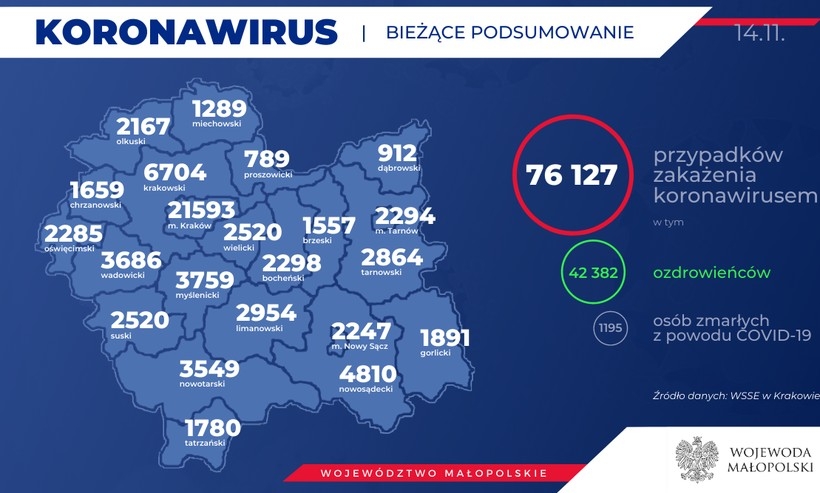 73 osoby z powiatu wadowickiego dowiedziały się ostatniej doby, że mają Covid19. Sanepid zanotował spadek zachorowań.