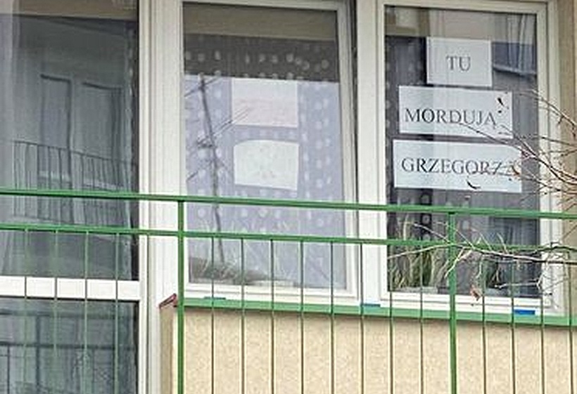 Uciążliwy sąsiad nic sobie z tego nie robi. Na oknach mieszkania wywiesił napis „Tu mordują Grzegorza”, do tego ozdobił go flagą Polski i własnoręcznie wymalowanym orłem w koronie.