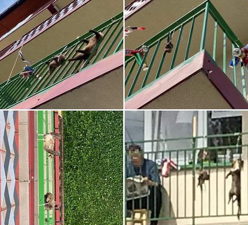 Mężczyzna kilka dni temu powiesił na sznurku na swoim balkonie martwe zwierzęta. Tak wiszą i szokują ludzi przechadzających się pod blokiem. Pytamy sąsiadów, czy to atrapa.