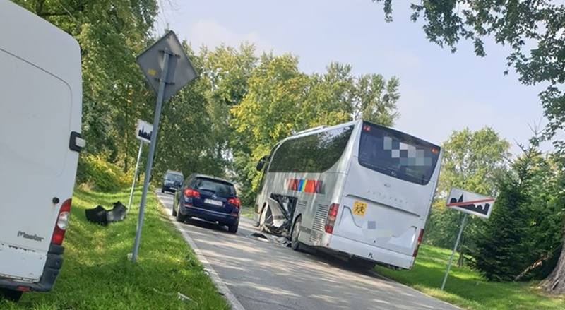 Siła uderzenia spowodowała, że bus zjechał z drogi natomiast autokar zatrzymał się na poboczu.