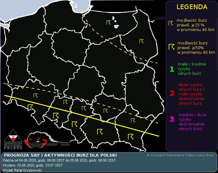 Głównym zagrożeniem będą ulewne opady deszczu, silniejsze porywy wiatru, lokalnie do 70 – 80 km/h oraz opady gradu do 1 cm – dodają Polscy Łowcy Burz.