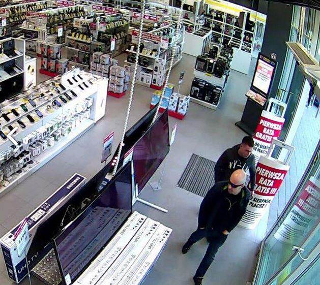 Łysy typ w ciemnych okularach ukradł w sklepie telewizor, miał pomocnika. Poznajecie ich?