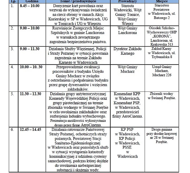 W pierwszym dniu planuje się ćwiczenia służb na wypadek podłożenia ładunku wybuchowego w Gimnazjum w Zakrzowie, w tym samym czasie w Andrychowie terroryści mają dokonać zatrucia wody podawanej go gminnej sieci Zakładu Wodociągów i Kanalizacji.