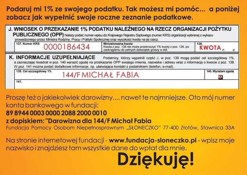 Jego rodzice pragną, by Michałek stanął kiedyś na własne nóżki, dlatego robią wszystko by zapewnić synkowi najlepsza opiekę. Przed maluszkiem kilka operacji. Wszystko to wiąże się z ogromnymi kosztami, dlatego Fundacja Pomocy „Słoneczko” wzięła pod opiekę Michałka, każdy z nas może pomóc.