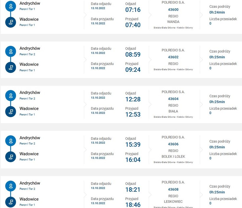 Na atrakcyjność przejazdu od stacji do stacji między miastami wpływa też liczba połączeń. Tych nie jest  obecnie dużo. W dzień powszedni to zaledwie pięć połączeń z Wadowic do Andrychowa, z czego ostatni odjazd jest o godz. 15.10.