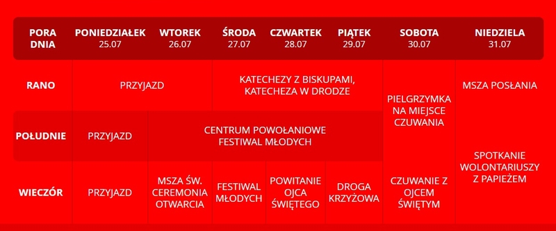 Tymczasem opracowano już program spotkań w ramach Światowych Dni Młodzieży. Najwięcej będzie się działo w godzinach popołudniowo-wieczornych. Organizatorzy spodziewają się, że w tak zwanych centralnych wydarzeniach brać będzie udział od 500 tys. do 2 mln. pielgrzymów. Najwięcej z nich będzie zapewne na mszy Świętej Posłania, która celebrowana będzie przez Ojca Świętego.