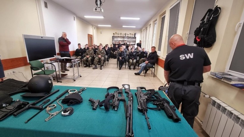 Młodzież miała okazję zapoznać się z bronią stosowaną przez więziennych strażników oraz omówiono zasady używania środków przymusu bezpośredniego.