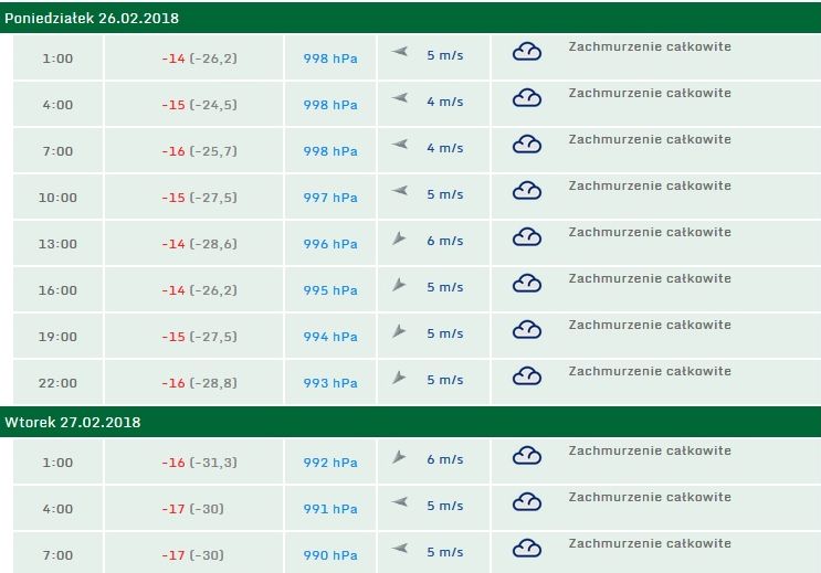W nocy 24/25.02 prognozuje się temperaturę minimalną od -18°C do -15°C, w pozostałym okresie od -22°C do -18°C. Temperatura maksymalna od -13°C do -11°C. Wiatr o średniej prędkości od 15 km/h do 25 km/h – informuje Piotr Wałach, z Centralnego Biura Prognoz Meteorologicznych w Krakowie.