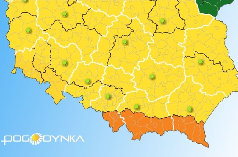 Mapa zasięgu zagrożenia drugiego stopnia wg IMGW ( I stopień – żółty, II stopień – pomarańczowy)