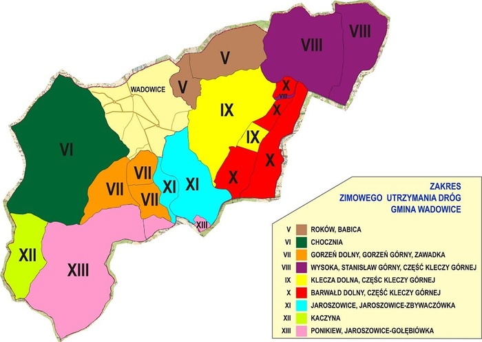 W sezonach 2019/2020, 2020/2021, 2021/2022 za Zimowe Utrzymanie Dróg w Gminie Wadowice odpowiadają następujące firmy: F.U.H.P. Transkop Łukasz Sopicki/ zakres: I,II, III,IV,V, XI,XIII/ tel: 693 727 856; OSP Chocznia/ zakres: VI,VII,XII/ tel: 509 851 131; Usługi Rolnicze i Transportowe Grzegorz Mojski/ zakres: IX, X/ tel: 509 937 476; AGRO-KOM Michał Kania/ zakres: VIII/ tel: 509 121 362 – wymieniają w komunikacie urzędnicy.