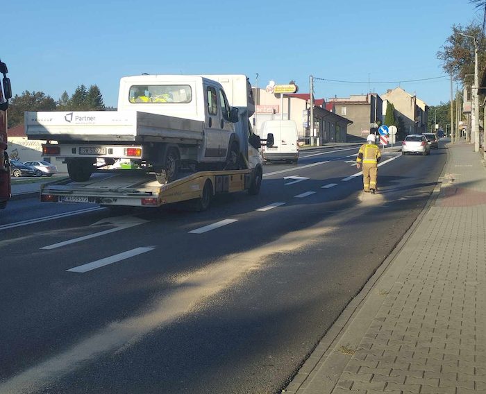 Trzeba było wezwać strażaków, którzy zajęli się zabezpieczeniem płynów ropopochodnych. Plama bowiem mogła stanowić zagrożenie dla prawidłowej przyczepności poruszających się po krajówce aut.