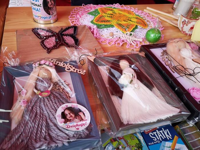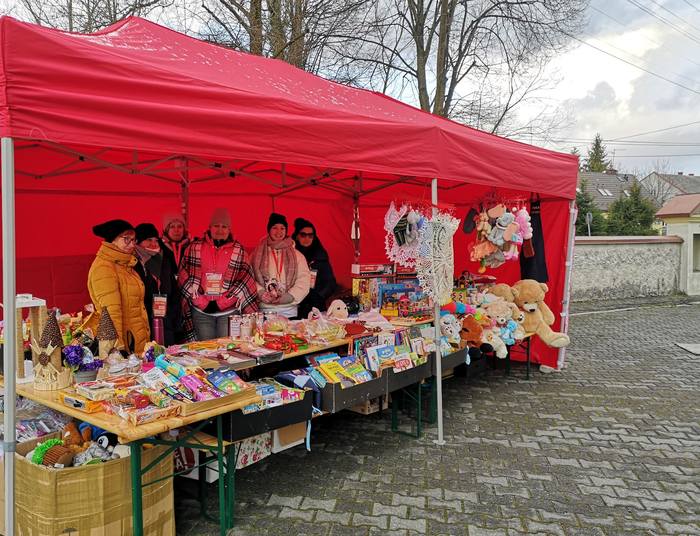 Grupa zaprawionych w bojach wolontariuszy, która nazywa siebie „rodziną”, głównie Panie, ale jest też wśród nich Pan, wystawiła pod kościołem namiot i rozłożyła fanty, które można było nabyć.