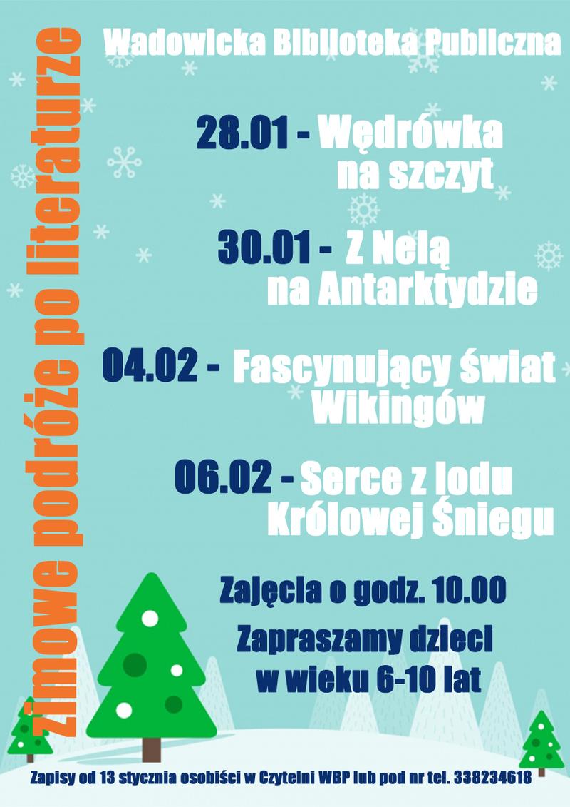 WADOWICE – Wadowicka biblioteka Publiczna zaprasza wszystkie dzieci w wieku od 6 do 10 lat, które lubią twórczo i miło spędzać czas, na zajęcia z cyklu „Zimowe podróże po literaturze”.
