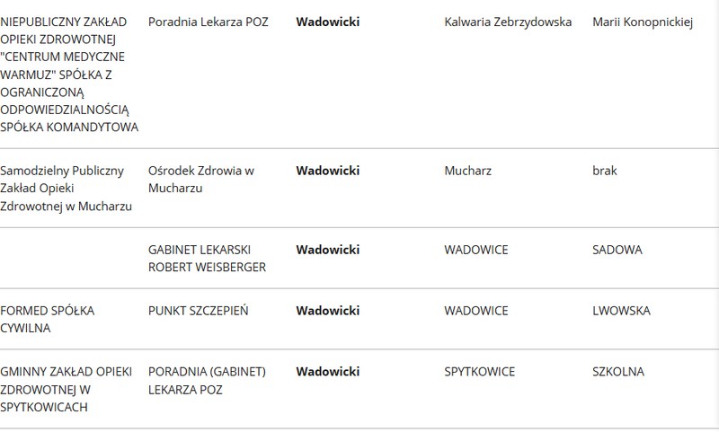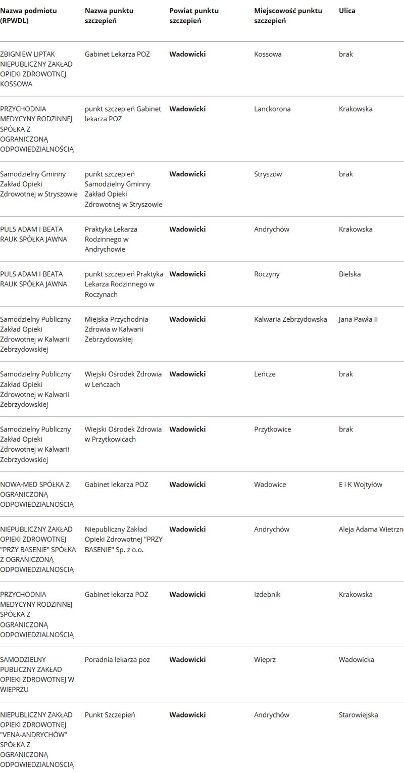 W powiecie wadowickim, do tej pory zgłosiło się 18 podmiotów, gdzie będzie można się zaszczepić. W Kossowej szczepić będzie NZOZ Zbigniew Liptak, w Lanckoronie – Przychodnia Medycyny Rodzinnej, ulica Krakowska. Stryszów szczepić będzie w gminnym Samodzielnym ZOZ.